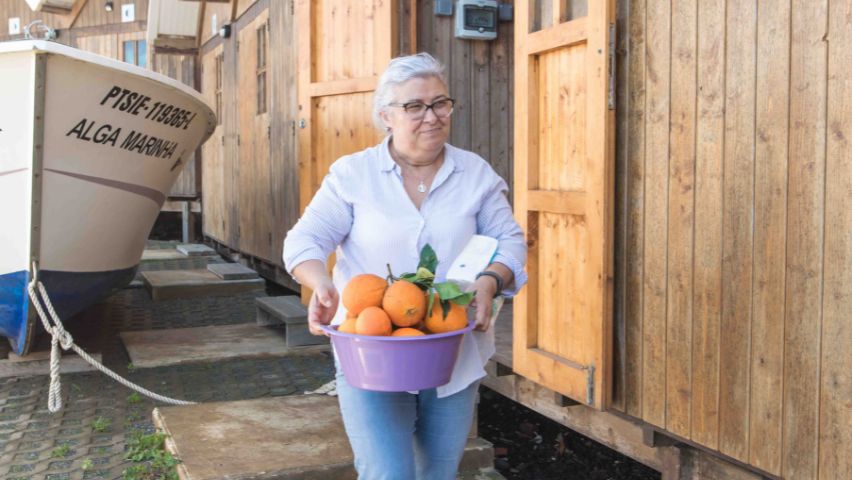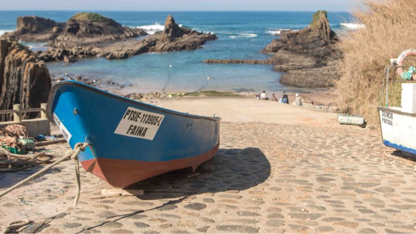Tout au long de ces deux jours, nous étions en compagnie de Jorge Vilhena, un archéologue de la région. Il nous a fait remonter le temps pour découvrir l’histoire de l’Alentejo à travers quelques lieux emblématiques de la région tels que : la nécropole de Pardieiro à São Martinho das Amoreiras, la Chappelle de Santa Anica, la rivière Mira sur les quais d’Odemira, et enfin les falaises des Sentiers des Pêcheurs à Almograve. Près de ce dernier endroit, nous nous sommes arrêtés au port de pêcheur de Lapa das Pombas pour déjeuner avec le pêcheur Vitor Gonçalves et son fils Leonel qui nous ont gentiment préparé un ragoût de poisson appelé “Caldeirada de peixe” avec du poisson frais pêché par eux le matin. Ce fut une occasion spéciale où nous avons pu goûter à la variété des produits du terroir: le pain, les olives, le fromage… Cette rencontre a été organisée par la Présidente du Conseil Paroissial d’Almograve qui a préparé un délicieux gâteau à l’orange et distribué des oranges pour conclure ce repas.