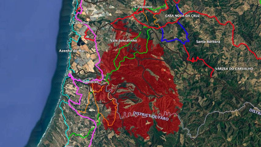 Conforme é visível nos mapas, o fogo lavrou por terrenos onde os trilhos da Rota Vicentina passam.