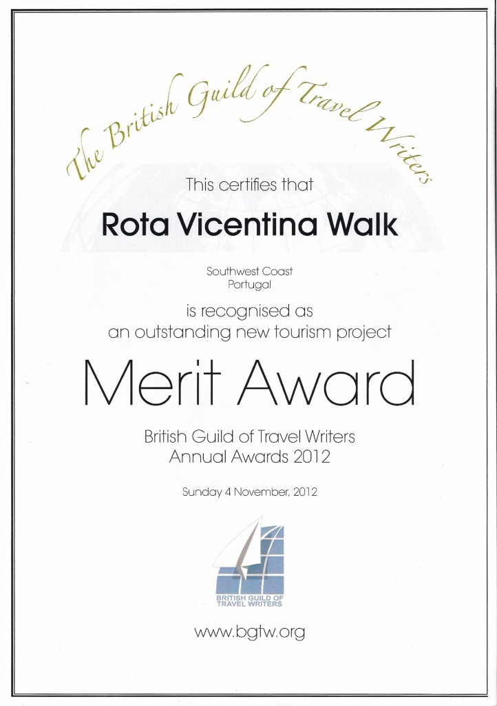 A Rota Vicentina recebeu um prémio de mérito por parte do prestigiado British Guild of Travel Writers (Sociedade Britânica de Escritores de Viagens), durante o mítico jantar de gala do dia 4 de Novembro de 2012, que acontece anualmente no Savoy Hotel, em Londres. Este prémio internacional é um importante estímulo ao trabalho de consolidação do projecto e sua promoção nos mercados externos, particularmente no Reino Unido onde a Rota Vicentina tem sido tão bem recebida.